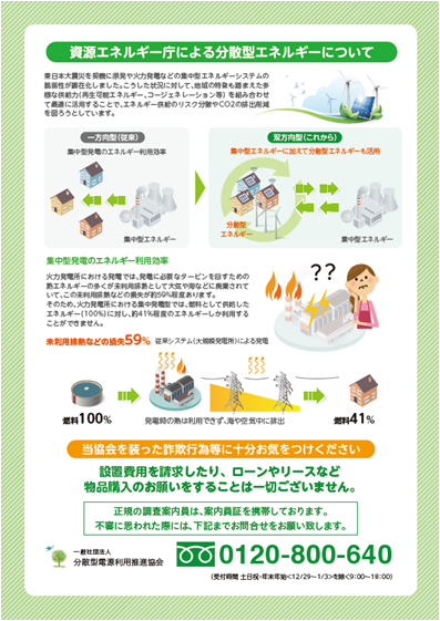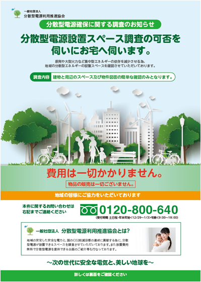 - 分散型電源の設置スペースの確認で調査員が対象エリアを訪問させていただいております。下記のご案内をさせていただきました住宅には、簡単な調査と物件図面の確認をお願いさせていただいております。当調査は完全に無料の調査になりますので、正規の案内員は物品購入などのお願いをすることは一切ありません。不審な事がありましたら「0120-800-640」までご相談ください。